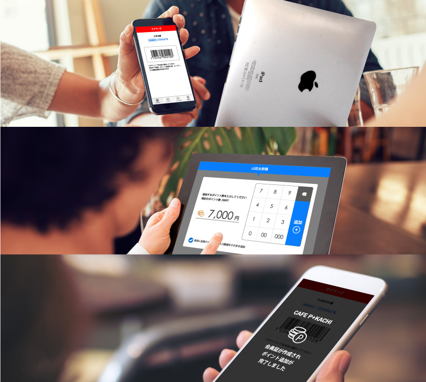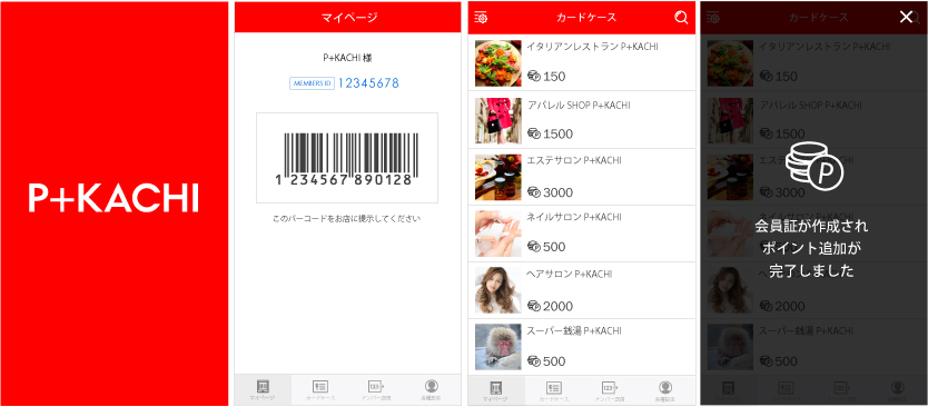 「P+KACHI」アプリがお財布の中にある複数のポイントカードの代わりとなり、それぞれのお店の会員証を提示することなく、アプリ経由で利用できる共通バーコードを提示すると、店舗の会員証を作成したり、ポイントを貯めたりできます。