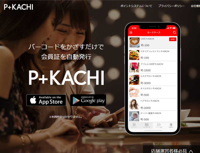 「P+KACHI」アプリは、このアプリ1つでお店の会員証やポイントカードをまとめて管理できるサービスです。